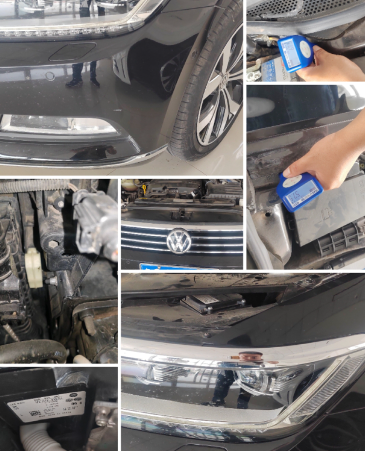 老规矩先来看一下这辆车前面的情况,前杠更换喷漆修复,水箱框架更换,大灯没有更换修复痕迹,叶子板骨架无变形修复的痕迹,减震器底座无变形修复的痕迹。